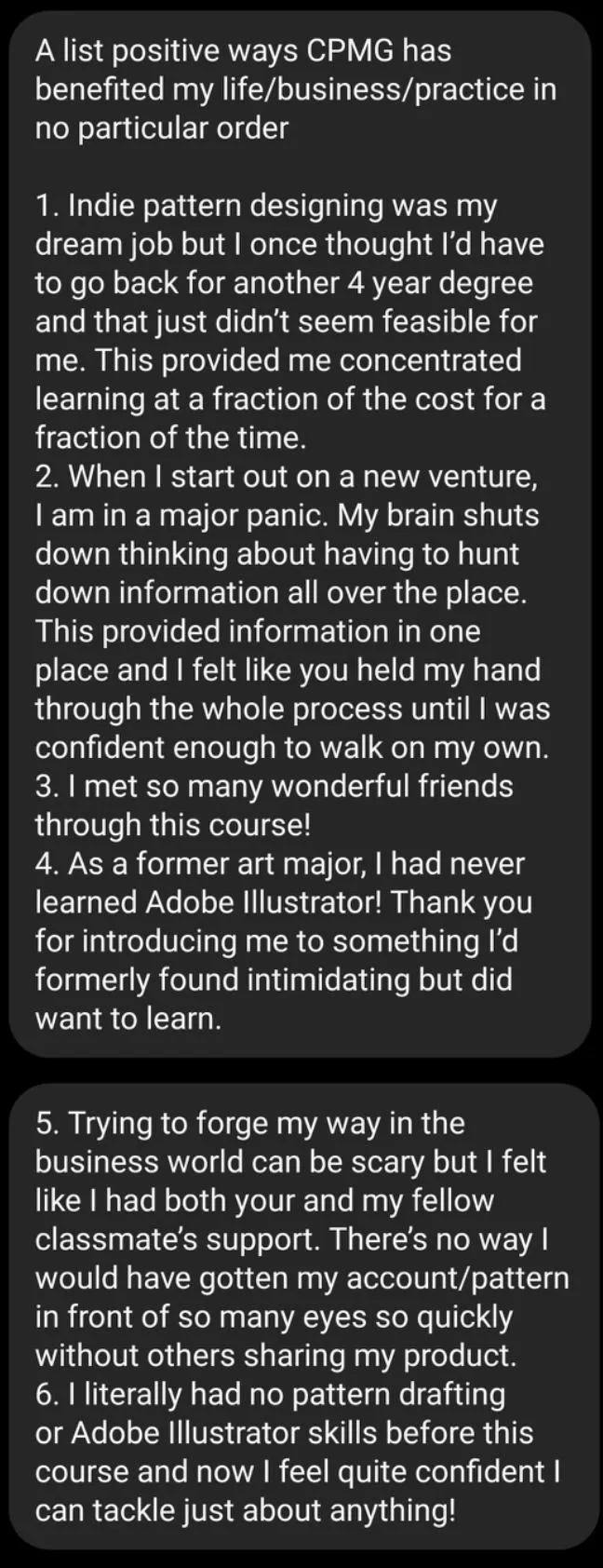 CPMG is designed to fit into your normal life. You'll be able to study and sew on your own schedule and at your own pace. Many students have successfully completed the course while also working full time, being a mom, or balancing other major life commitments.