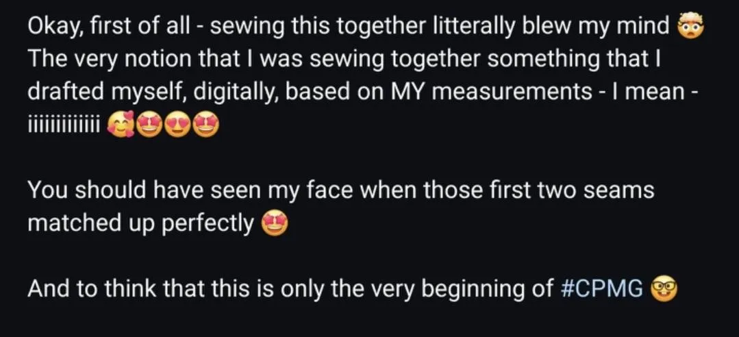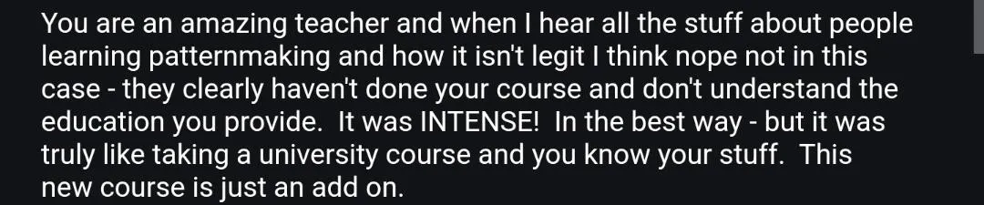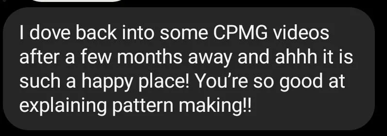 This course is absolutely the sort of course where the more time you can dedicate to it, the more you'll get out of it. That's because we emphasize applied learning inside of CPMG, meaning we want you to take the new skills you're learning and use them to draft and grade patterns of your own creation.