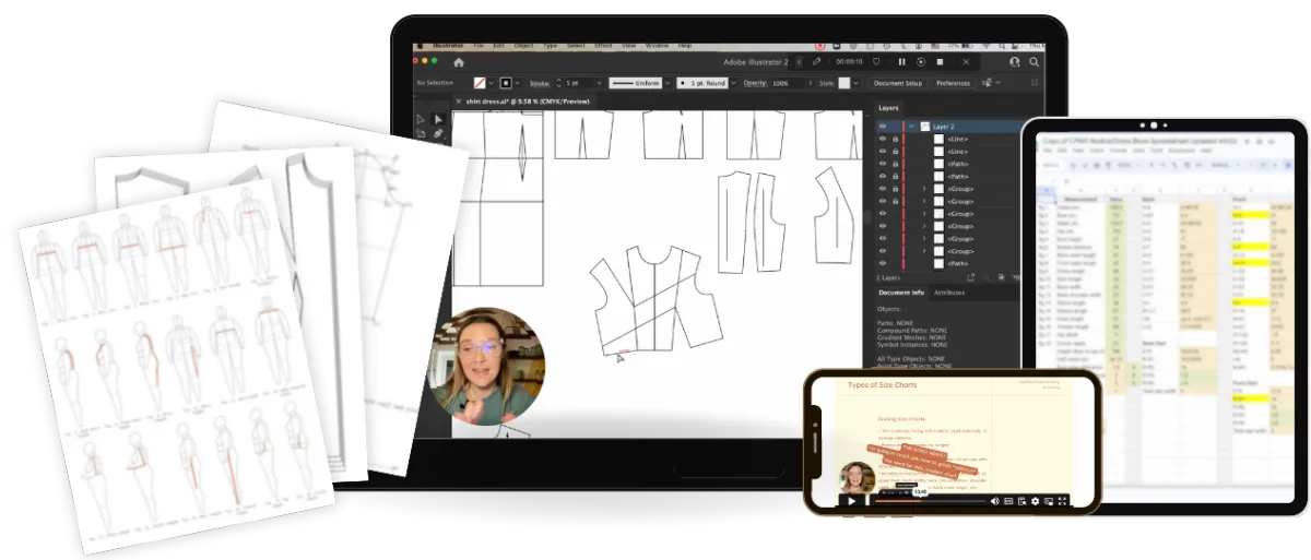 The program is made up of three courses: Illustrator Basics, Confident Patternmaking, and Size-Inclusive Pattern Grading. Each course is divided into modules with step-by-step video lessons that help you build a strong foundation from the ground up.
